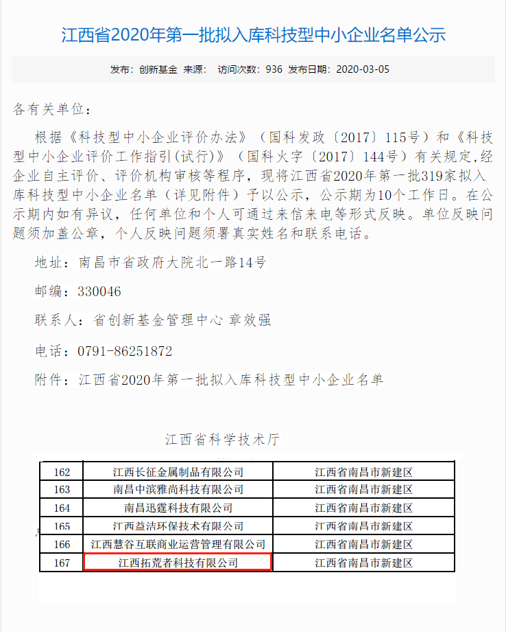2020年3月4日,江西拓荒者科技有限公司榮選江西省擬入庫科技型中小企業名單。