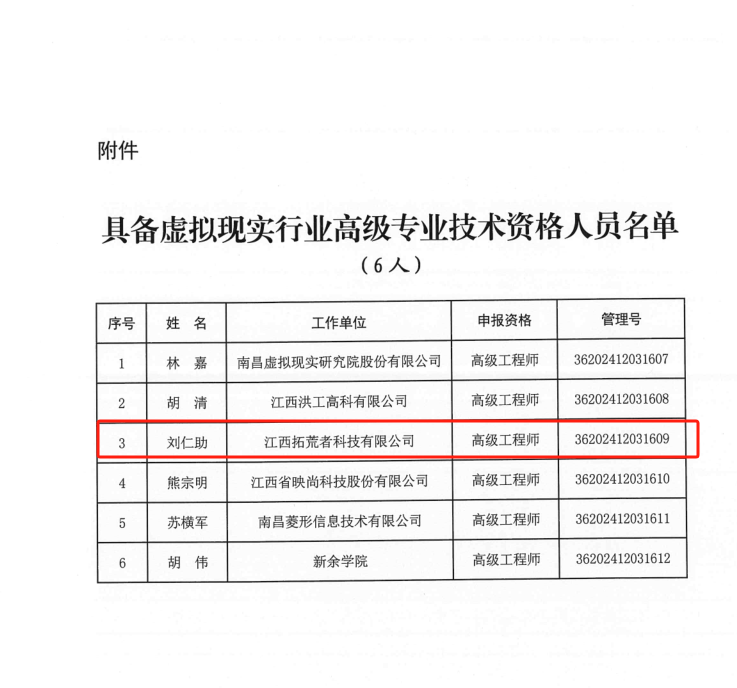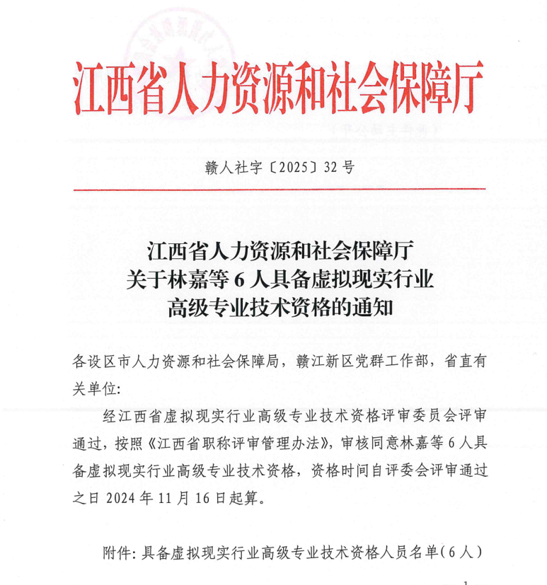 近日,江西省人力資源和社會保障廳發(fā)布《關于林嘉等 6 人具備虛擬現(xiàn)實行業(yè)高級專業(yè)技術資格的通知》(贛人社字〔2025〕32 號),江西拓荒者科技有限公司總經(jīng)理劉仁助順利通過評審,獲得虛擬現(xiàn)實行業(yè)高級工程師資格,資格自2024年11 月16 日起生效。