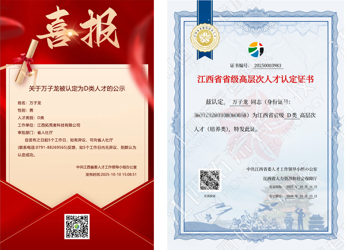 近日,從中共江西省委人才工作領導小組辦公室傳來捷報,經省人社廳嚴格審批,我司員工萬子龍憑借扎實的專業能力、突出的行業貢獻及良好的職業素養,成功認定為江西省 D 類高層次人才。