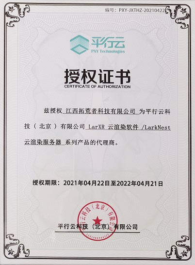 日前,公司獲得平行云科技(北京)有限公司LarkXR云渲染軟件/Lark Nest云渲染服務器系統產品的代理商(編號:PXY-JXTHZ-20210422)。