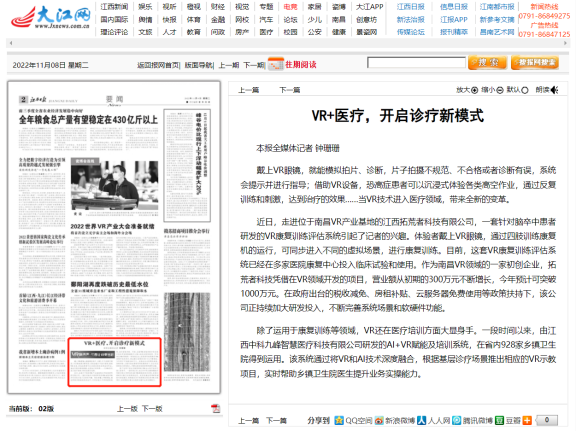 1、江西日報2版報道《基于VR技術的康復評定與訓練系統裝置》,這是今年下半年該項目公司第三次接受新聞媒體的報道